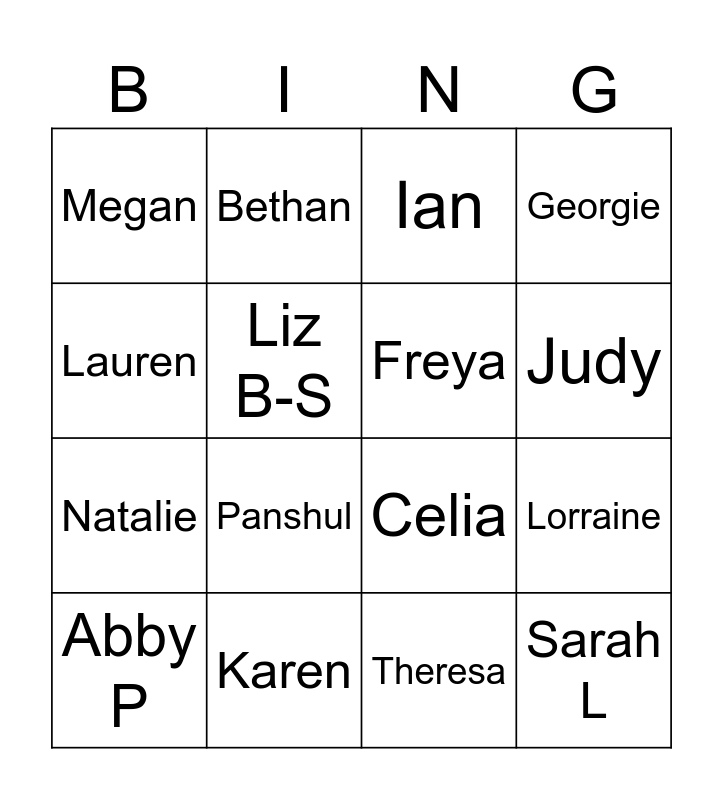 This bingo card has 47 words: Free!, Abby P, Alex A, Alex Mac, Anna, Ash, Bethan, Chloe, Liz B-S, Eva, Freya, Georgie, Gill J, Helen, Jimbo, Josh, Judy, Karen, Katie, Lauren, Lorraine, Margaret, Megan, Natalie, Ollie, Panshul, Phil, Phoebe, Sarah E, Sarah L, Shan, Sheridan, Sophia, Sue, Tom C, Tom M, Theresa, Tusker, Val, Luke, Sam, Ian, Celia, Cari, Jackie, Abbie S and Lizzie.