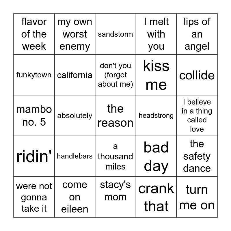 This bingo card has 30 words: come on eileen, teenage dirtbag, absolutely, running up that hill, flavor of the week, sandstorm, california, a thousand miles, headstrong, stacy's mom, I believe in a thing called love, the reason, crank that, turn me on, collide, you're beautiful, bad day, ridin', handlebars, lips of an angel, mambo no. 5, tubthumping, my own worst enemy, kiss me, funkytown, I melt with you, the safety dance, were not gonna take it, don't you (forget about me) and you spin me round.
