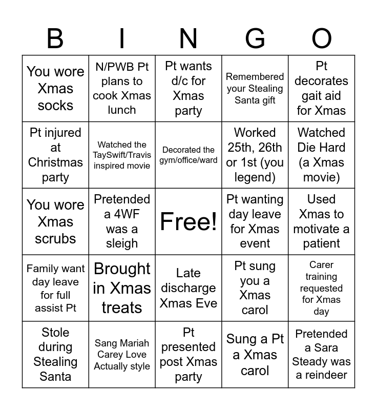 This bingo card has a free space and 27 words: Pt sung you a Xmas carol, Got asked if you had to work Xmas, Worked 25th, 26th or 1st (you legend), Pt presented post Xmas party, Pt injured at Christmas party, Pt wants d/c for Xmas party, N/PWB Pt plans to cook Xmas lunch, Family want day leave for full assist Pt, Pt wanting day leave for Xmas event, Carer training requested for Xmas day, You wore Xmas scrubs, Remembered your Stealing Santa gift, Stole during Stealing Santa, Sang Mariah Carey Love Actually style, Watched Die Hard (a Xmas movie), Patient called Santa or Claus, Watched the TaySwift/Travis inspired movie, Decorated the gym/office/ward, Brought in Xmas treats, You wore Xmas socks, Used Xmas to motivate a patient, Sung a Pt a Xmas carol, Pretended a 4WF was a sleigh, Pretended a Sara Steady was a reindeer, Late discharge Xmas Eve, Pt decorates gait aid for Xmas and You wore Xmas scrunchie or headband.
