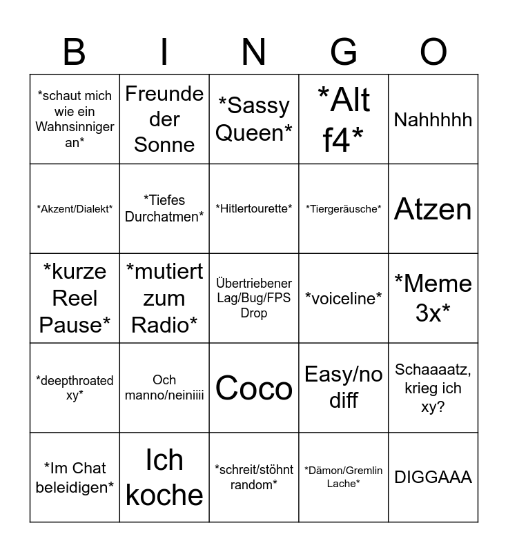 This bingo card has a free space and 24 words: *Im Chat beleidigen*, Och manno/neiniiii, *Hitlertourette*, *Dämon/Gremlin Lache*, Nahhhhh, *schaut mich wie ein Wahnsinniger an*, Freunde der Sonne, *Sassy Queen*, *voiceline*, *Meme 3x*, *kurze Reel Pause*, *Tiefes Durchatmen*, Easy/no diff, Schaaaatz, krieg ich xy?, *Akzent/Dialekt*, Ich koche, *schreit/stöhnt random*, *Alt f4*, Atzen, *deepthroated xy*, *mutiert zum Radio*, Coco, *Tiergeräusche* and DIGGAAA.