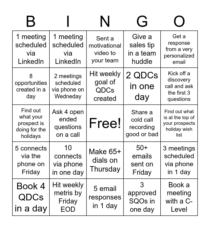 This bingo card has a free space and 24 words: 10 connects via phone in one day, Hit weekly metris by Friday EOD, Hit weekly goal of QDCs created, Book 4 QDCs in a day, Get a response from a very personalized email, 1 meeting scheduled via LinkedIn, 8 opportunities created in a day, 1 meeting scheduled via LinkedIn, Share a cold call recording good or bad, Make 65+ dials on Thursday, 2 QDCs in one day, Find out what your prospect is doing for the holidays, 50+ emails sent on Friday, 3 meetings scheduled via phone in 1 day, 2 meetings scheduled via phone on Wedneday, 3 approved SQOs in one day, Find out what is at the top of your prospects holiday wish list, Sent a motivational video to your team, Kick off a discovery call and ask the first 3 questions, Ask 4 open ended questions on a call, Book a meeting with a C-Level, 5 connects via the phone on Friday, Give a sales tip in a team huddle and 5 email responses in 1 day.