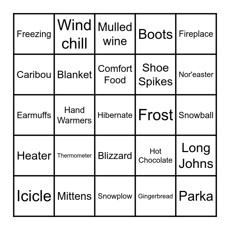 This bingo card has 35 words: Apple Cider, Avalanche, Black Ice, Blanket, Blizzard, Boots, Caribou, Cold, Comfort Food, Dog sled, Earmuffs, Fireplace, Flannel, Flurries, Freezing, Frost, Gingerbread, Hand Warmers, Heater, Hibernate, Hot Chocolate, Icicle, Long Johns, Mittens, Mulled wine, Nor'easter, Parka, Pinecone, Shoe Spikes, Snowball, Snowflake, Snowplow, Thermometer, Wind chill and Wintertime.