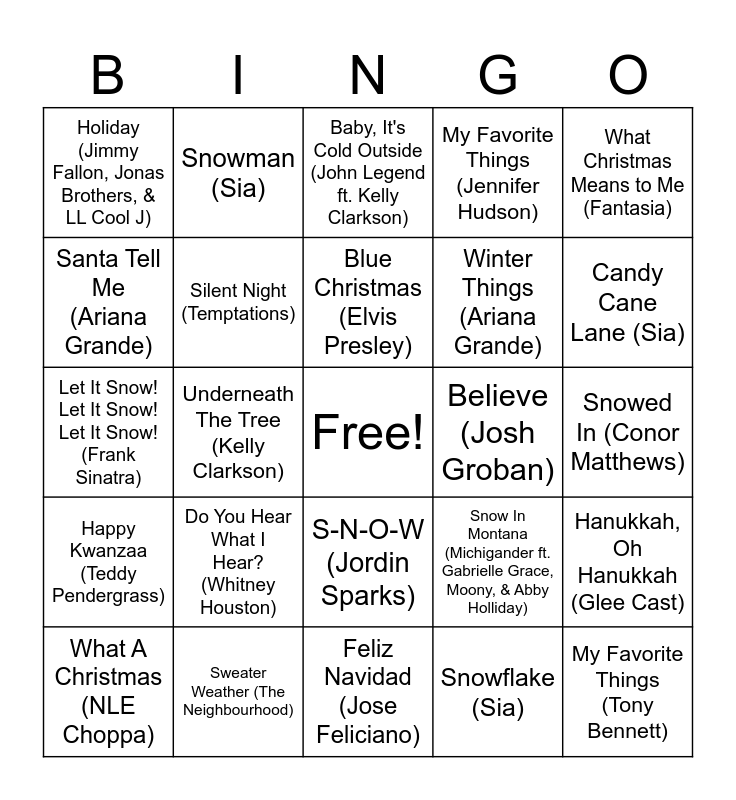 This bingo card has a free space and 75 words: Merry Christmas, Happy Holidays (NSYNC), Silver Bells (John Legend), Baby, It's Cold Outside (John Legend ft. Kelly Clarkson), 8 Days of Christmas (Destiny's Child), Cold December Night (Michael Buble), This Christmas (Chris Brown), Frosty The Snowman (Pentatonix ft. Alessia Cara), Last Christmas (Wham!), Winter Wonderland/Don't Worry Be Happy (Pentatonix ft. Tori Kelly), Sleigh Ride (The Ronettes), All I Want for Christmas Is You (Mariah Carey), Hot Chocolate (Tom Hanks), Blue Christmas (Elvis Presley), Santa Tell Me (Ariana Grande), Let It Snow (Boys II Men ft. Brian McKnight), Underneath The Tree (Kelly Clarkson), A Nonsense Christmas (Sabrina Carpenter), My Favorite Things (Tony Bennett), Run Rudolph Run (Chuck Berry), What Christmas Means to Me (Fantasia), Mistletoe (Justin Bieber), Let It Snow! Let It Snow! Let It Snow! (Frank Sinatra), Silent Night (Temptations), Snowman (Sia), My Favorite Things (Jennifer Hudson), You're A Mean One Mr. Grinch (Thurl Ravenscroft), Rudolph The Red-Nosed Reindeer (Meghan Trainor ft. Jayden Toney, Marcus, Toney, Jenna Toney), One More Sleep (Leona Lewis), The Twelve Days of Christmas (Perry Como & Mitchell Ayres & His Orchestra), Winter Song (Zara Larsson), I Saw Mommy Kissing Santa Claus (Jackson 5), Joyful Joyful (Jvck James), Let It Snow (MaKenzie), Snow In Montana (Michigander ft. Gabrielle Grace, Moony, & Abby Holliday), Candy Cane Lane (Sia), Winter Things (Ariana Grande), Wrap Me Up (Jimmy Fallon & Meghan Trainor), The Chipmunk Song (Bryson Tiller & Pentatonix), Snowed In (Conor Matthews), Snowflake (Sia), Rockin' Around the Christmas Tree (Kacy Musgraves ft. Camila Cabello), Holiday Party (Dan + Shay), Evergreen (Tiera Kennedy), Naughty List (Mitchell Tepenny), Round and Round (Sia), Do You Want to Build a Snowman? (Mickey Guyton), What A Christmas (NLE Choppa), Holiday (Jimmy Fallon, Jonas Brothers, & LL Cool J), Winter Dream (Freya Skye), Hey Rudy (Jimmy Fallon & The Roots), Parson Brown (Dan + Shay), S-N-O-W (Jordin Sparks), Snow Globe (Blessing Offor), The Christmas Song (Nat "King" Cole), You'll Be There (Jimmy Fallon & Justin Timberlake), Rudolph the Red-Nose Reindeer (The Temptations), Try A Little Tenderness (Chris Brown), winter wonderland (Bryson Tiller), This X-mas (Chris Brown ft. Ella Mai), presents (Bryson Tiller ft. Kiana Lede), Do You Hear What I Hear? (Whitney Houston), Favorite Time of Year (Dru Hill), Snowflakes (BJ the Chicago Kid ft. Susan Carol), Winter Paradise (Destiny's Child), The Polar Express (Tom Hanks), Believe (Josh Groban), Dance of the Sugar Plum Fairy (Pentatonix), Winter Wonderland/Here Comes Santa (Snoop Dogg & Anna Kendrick), Santa Claus Is Coming to Town (Jackson 5), Hanukkah, Oh Hanukkah (Glee Cast), Happy Kwanzaa (Teddy Pendergrass), Sweater Weather (The Neighbourhood), Auld Lang Syne (Ingrid Michaelson), Feliz Navidad (Jose Feliciano) and Jingle Bell Rock (Bobby Helms).