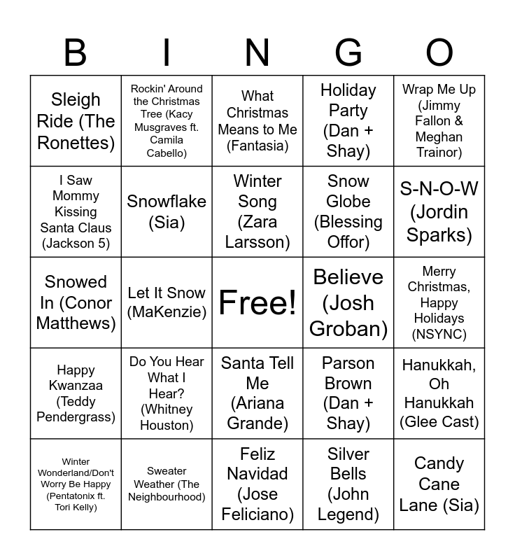 This bingo card has a free space and 75 words: My Favorite Things (Tony Bennett), Run Rudolph Run (Chuck Berry), What Christmas Means to Me (Fantasia), Mistletoe (Justin Bieber), Let It Snow! Let It Snow! Let It Snow! (Frank Sinatra), Silent Night (Temptations), Snowman (Sia), My Favorite Things (Jennifer Hudson), You're A Mean One Mr. Grinch (Thurl Ravenscroft), RudolphThe Red-Nosed Reindeer (Meghan Trainor ft. Jayden Toney, Marcus, Toney, Jenna Toney), One More Sleep (Leona Lewis), The Twelve Days of Christmas (Perry Como & Mitchell Ayres & His Orchestra), Winter Song (Zara Larsson), I Saw Mommy Kissing Santa Claus (Jackson 5), Joyful Joyful (Jvck James), Let It Snow (MaKenzie), Snow In Montana (Michigander ft. Gabrielle Grace, Moony, & Abby Holliday), Candy Cane Lane (Sia), Winter Things (Ariana Grande), Wrap Me Up (Jimmy Fallon & Meghan Trainor), The Chipmunk Song (Bryson Tiller & Pentatonix), Snowed In (Conor Matthews), Snowflake (Sia), Rockin' Around the Christmas Tree (Kacy Musgraves ft. Camila Cabello), Holiday Party (Dan + Shay), Evergreen (Tiera Kennedy), Naughty List (Mitchell Tepenny), Round and Round (Sia), Do You Want to Build a Snowman? (Mickey Guyton), What A Christmas (NLE Choppa), Holiday (Jimmy Fallon, Jonas Brothers, & LL Cool J), Winter Dream (Freya Skye), Hey Rudy (Jimmy Fallon & The Roots), Parson Brown (Dan + Shay), S-N-O-W (Jordin Sparks), Snow Globe (Blessing Offor), The Christmas Song (Nat "King" Cole), You'll Be There (Jimmy Fallon & Justin Timberlake), Merry Christmas, Happy Holidays (NSYNC), Silver Bells (John Legend), Baby, It's Cold Outside (John Legend ft. Kelly Clarkson), 8 Days of Christmas (Destiny's Child), Cold December Night (Michael Buble), This Christmas (Chris Brown), Frosty The Snowman (Pentatonix ft. Alessia Cara), Last Christmas (Wham!), Winter Wonderland/Don't Worry Be Happy (Pentatonix ft. Tori Kelly), Sleigh Ride (The Ronettes), All I Want for Christmas Is You (Mariah Carey), Hot Chocolate (Tom Hanks), Blue Christmas (Elvis Presley), Santa Tell Me (Ariana Grande), Let It Snow (Boys II Men ft. Brian McKnight), Underneath The Tree (Kelly Clarkson), A Nonsense Christmas (Sabrina Carpenter), Rudolph the Red-Nose Reindeer (The Temptations), Try A Little Tenderness (Chris Brown), winter wonderland (Bryson Tiller), This X-mas (Chris Brown ft. Ella Mai), presents (Bryson Tiller ft. Kiana Lede), Do You Hear What I Hear? (Whitney Houston), Favorite Time of Year (Dru Hill), Snowflakes (BJ the Chicago Kid ft. Susan Carol), Winter Paradise (Destiny's Child), The Polar Express (Tom Hanks), Believe (Josh Groban), Dance of the Sugar Plum Fairy (Pentatonix), Winter Wonderland/Here Comes Santa (Snoop Dogg & Anna Kendrick), Santa Claus Is Coming to Town (Jackson 5), Hanukkah, Oh Hanukkah (Glee Cast), Happy Kwanzaa (Teddy Pendergrass), Sweater Weather (The Neighbourhood), Auld Lang Syne (Ingrid Michaelson), Feliz Navidad (Jose Feliciano) and Jingle Bell Rock (Bobby Helms).