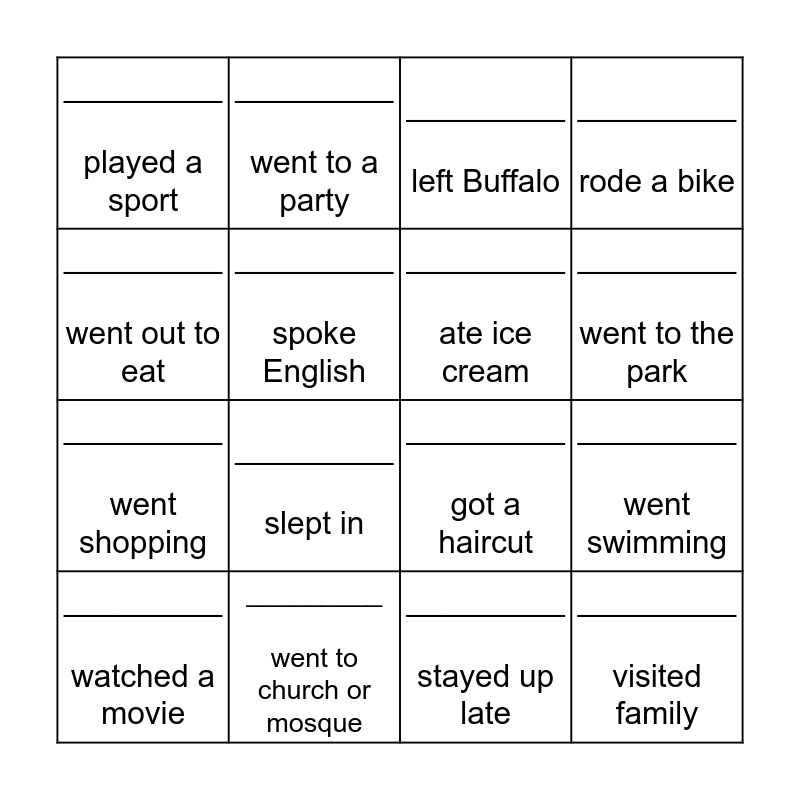 This bingo card has a free space and 15 words: _________ watched a movie, _________ visited family, _________ left Buffalo, _________ played a sport, _________ went to the park, _________ went out to eat, _________ slept in, _________ stayed up late, _________ spoke English, _________ went shopping, _________ went swimming, _________ rode a bike, _________ ate ice cream, _________ went to a party and _________ went to church or mosque.