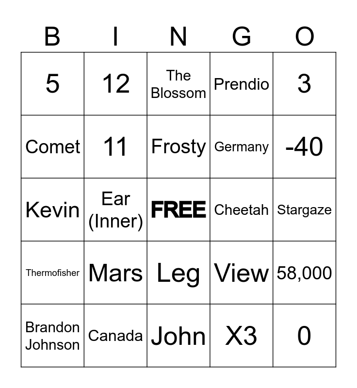 This bingo card has a free space and 24 words: Mars, Canada, Frosty, Brandon Johnson, 3, 5, Comet, 12, Cheetah, Leg, Germany, Kevin, View, 58,000, 11, X3, Stargaze, The Blossom, -40, Ear (Inner), 0, Thermofisher, Prendio and John.