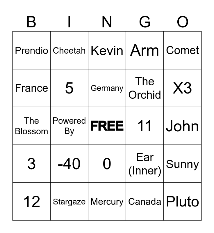 This bingo card has a free space and 34 words: Mars, Canada, Frosty, Brandon Johnson, 3, 5, Comet, 12, Cheetah, Leg, Germany, Kevin, View, 58,000, 11, X3, Stargaze, The Blossom, -40, Ear (Inner), 0, Thermofisher, Prendio, John, Mercury, Pluto, Arm, -80, The Orchid, France, Rahm, Powered By, Sunny and 20.