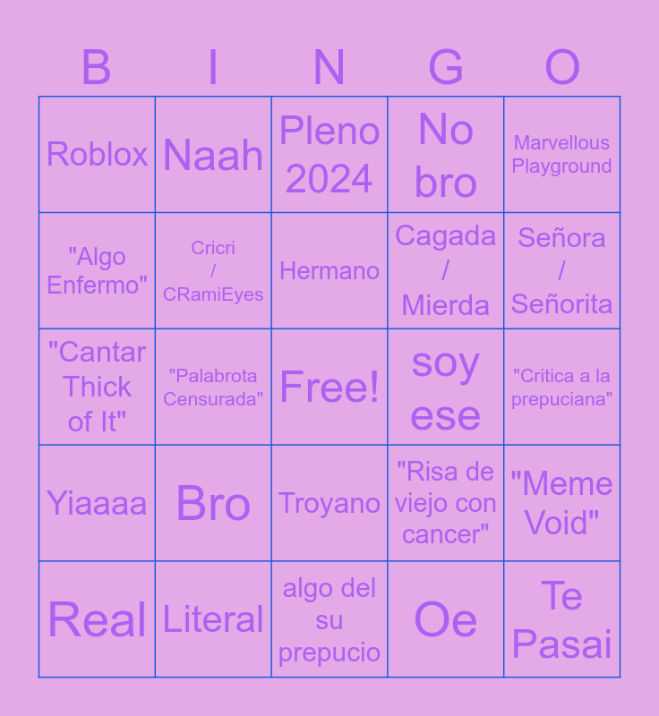 This bingo card has a free space and 24 words: Bro, Literal, Hermano, Real, Marvellous Playground, Roblox, "Algo Enfermo", Naah, soy ese, Troyano, Cagada / Mierda, "Cantar Thick of It", "Risa de viejo con cancer", "Meme Void", Cricri / CRamiEyes, Oe, "Critica a la prepuciana", Pleno 2024, Señora / Señorita, "Palabrota Censurada", Te Pasai, Yiaaaa, No bro and algo del su prepucio.