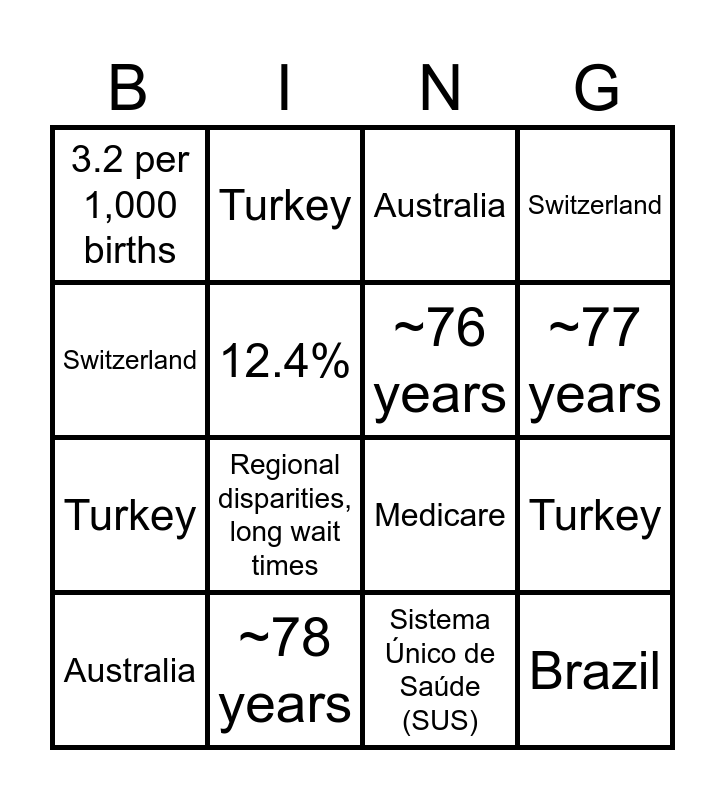 This bingo card has 25 words: Free!, United States, ~77 years, High costs, disparities in access, administrative complexities, Switzerland, 3.2 per 1,000 births, 12.4%, Turkey, ~78 years, Expansive primary care networks, Turkey, Medicare, 9.3%, Preventive care focus, equitable access, ~76 years, Brazil, Sistema Único de Saúde (SUS), Australia, Regional disparities, long wait times, Turkey, Australia, Turkey, Brazil, Switzerland and Australia.