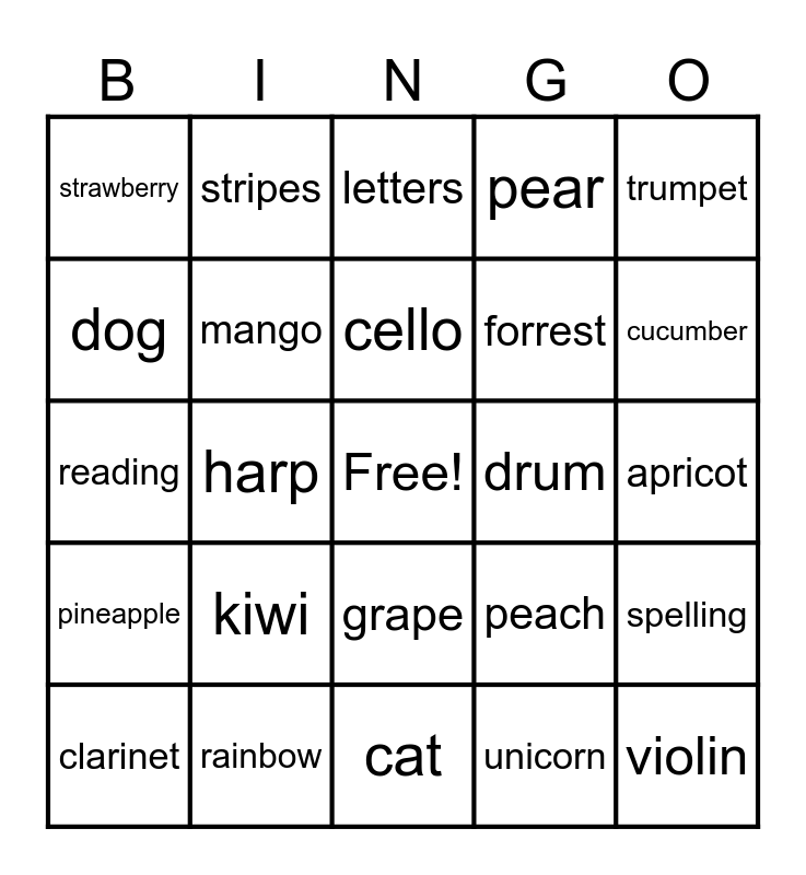 This bingo card has a free space and 39 words: bongo, apple, guitar, mango, clarinet, grape, cello, orange, trumpet, pineapple, harp, pear, violin, apricot, drum, kiwi, flute, strawberry, trombone, peach, dog, cat, forrest, cucumber, ribbit, moo, bark, meow, dots, stripes, colors, numbers, letters, rainbow, unicorn, dictionary, spelling, reading and math.