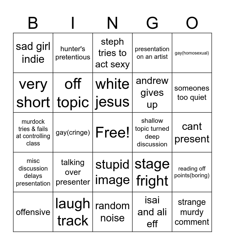 This bingo card has a free space and 24 words: talking over presenter, laugh track, white jesus, offensive, gay(homosexual), sad girl indie, very short, hunter's pretentious, shallow topic turned deep discussion, stupid image, andrew gives up, murdock tries & fails at controlling class, stage fright, reading off points(boring), off topic, isai and ali eff, cant present, steph tries to act sexy, someones too quiet, gay(cringe), strange murdy comment, misc discussion delays presentation, presentation on an artist and random noise.