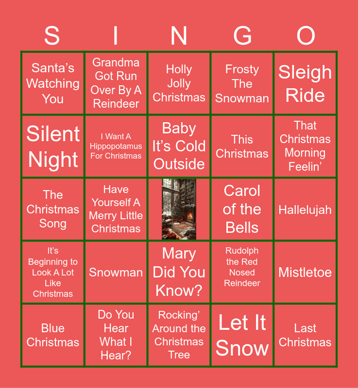 This bingo card has a free space and 36 words: Santa Tell Me, You’re A Mean One Mr. Grinch, Sweater Weather, I Want A Hippopotamus For Christmas, Rudolph the Red Nosed Reindeer, It’s Beginning to Look A Lot Like Christmas, Baby It’s Cold Outside, Little Saint Nick, Sleigh Ride, Home For The Holidays, Have Yourself A Merry Little Christmas, Frosty The Snowman, Jingle Bell Rock, Carol of the Bells, That Christmas Morning Feelin’, Santa’s Watching You, Dance of the Sugar Plum Fairy, Snowman, Last Christmas, Holly Jolly Christmas, Hallelujah, Mistletoe, Do You Hear What I Hear?, Blue Christmas, Rocking’ Around the Christmas Tree, Grandma Got Run Over By A Reindeer, The Christmas Song, Wrap Me Up, This Christmas, Silent Night, Silver Bells, We Wish You A Merry Christmas, Let It Snow, Mary Did You Know?, Little Drummer Boy and Mele Kalikimaka.