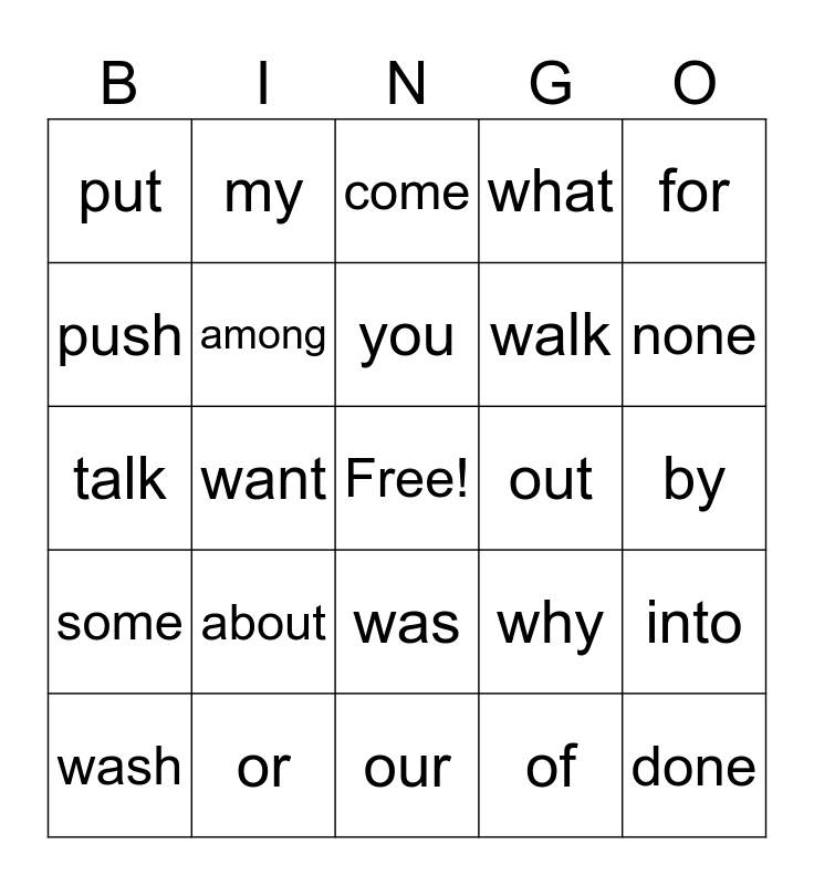 This bingo card has a free space and 26 words: was, of, you, or, for, put, push, my, by, why, walk, talk, into, wash, want, who, what, some, come, done, none, our, out, about, among and almost.