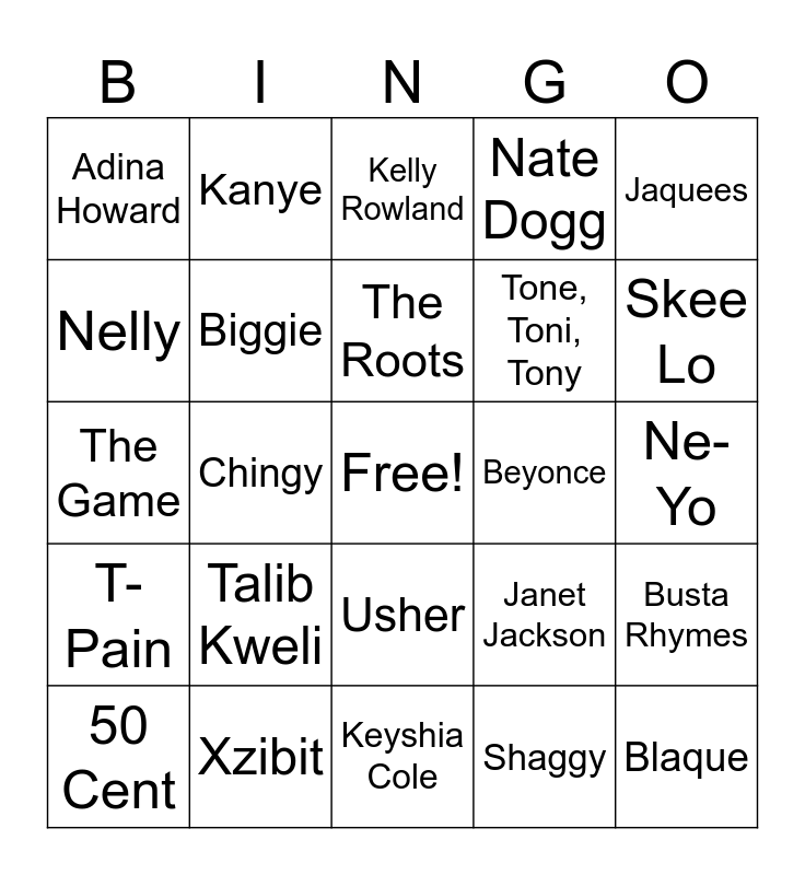 This bingo card has a free space and 27 words: Janet Jackson, Michael Jackson, Tone, Toni, Tony, Keyshia Cole, Nelly, Kelly Rowland, Kanye, T-Pain, Beyonce, Busta Rhymes, The Game, Nate Dogg, 50 Cent, Xzibit, Skee Lo, 2-Pac, Biggie, The Roots, Talib Kweli, Adina Howard, Ne-Yo, Shaggy, Chingy, Blaque, Usher, Jaquees and Lil Wayne.