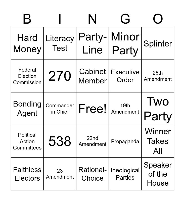 This bingo card has a free space and 24 words: 538, 23 Amendment, Cabinet Member, Faithless Electors, Splinter, Hard Money, Federal Election Commission, Literacy Test, 19th Amendment, 22nd Amendment, Executive Order, Bonding Agent, Propaganda, Winner Takes All, 270, Ideological Parties, Two Party, Party-Line, 26th Amendment, Commander in Chief, Speaker of the House, Political Action Committees, Minor Party and Rational-Choice.