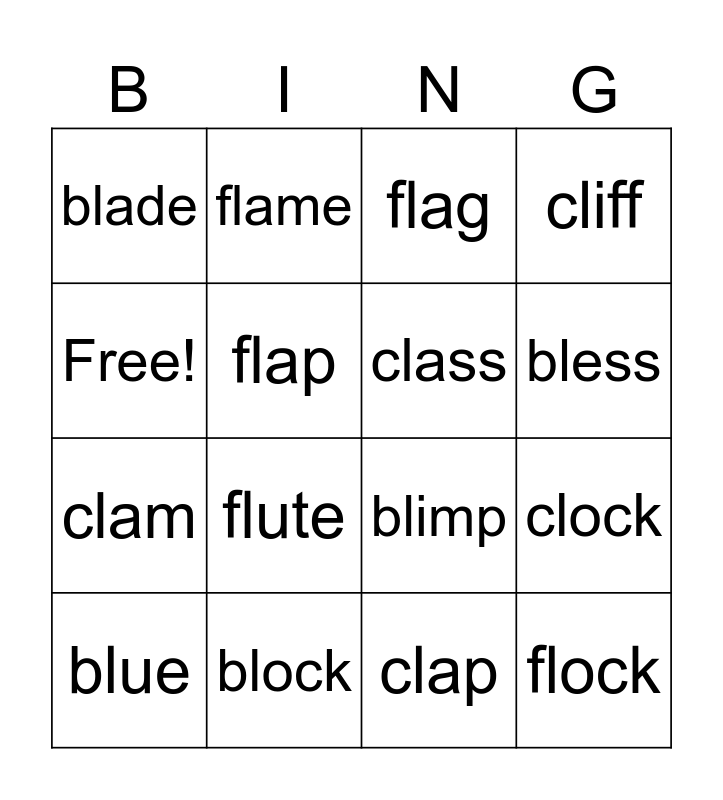 This bingo card has 16 words: block, clock, flag, blade, clam, flame, blimp, clap, Free!, flap, blue, cliff, flute, bless, class and flock.