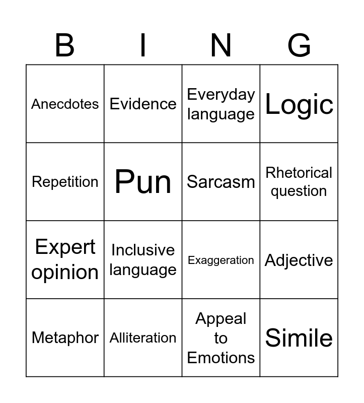 This bingo card has 16 words: Alliteration, Adjective, Everyday language, Anecdotes, Expert opinion, Evidence, Exaggeration, Appeal to Emotions, Repetition, Pun, Metaphor, Logic, Inclusive language, Rhetorical question, Sarcasm and Simile.