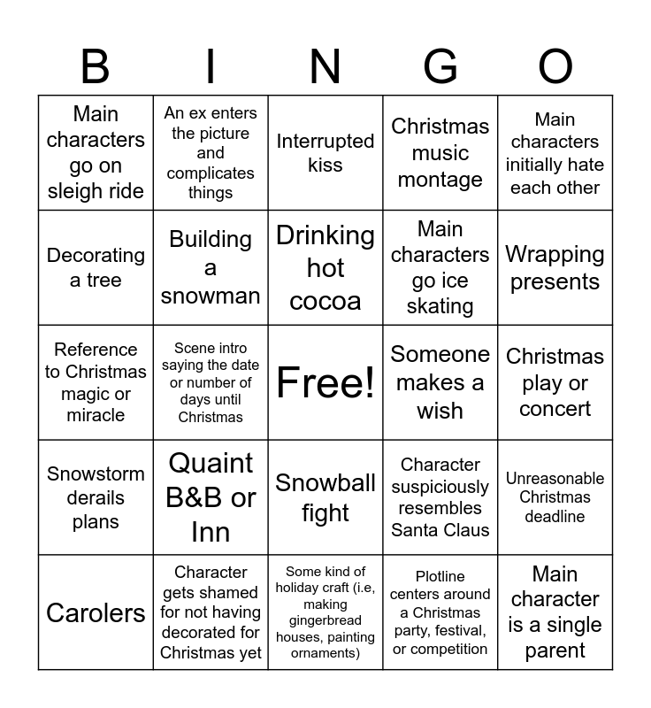 This bingo card has a free space and 35 words: Shameless holiday-themed name for a main character (i.e. Holly, Joy, Nick), Kiss under mistletoe, A job or business deal is at stake, Building a snowman, Snowball fight, Christmas music montage, Decorating a tree, Baking cookies, Drinking hot cocoa, Drinking eggnog, Reference to Christmas magic or miracle, Main characters initially hate each other, Christmas-hating grinch-like character, Dead loved one is major part of main character’s back story, Main characters go on sleigh ride, Someone makes a wish, Plotline centers around a Christmas party, festival, or competition, Scene intro saying the date or number of days until Christmas, Snowstorm derails plans, Main character is a single parent, Character suspiciously resembles Santa Claus, Carolers, Unreasonable Christmas deadline, Character gets shamed for not having decorated for Christmas yet, Interrupted kiss, Wrapping presents, A main character is rich or of high social standing, Something magical/supernatural happens, Main characters go ice skating, Christmas play or concert, It starts snowing, to the awe of the characters, Some kind of holiday craft (i.e, making gingerbread houses, painting ornaments), Quaint B&B or Inn, An ex enters the picture and complicates things and Christmas tree farm.