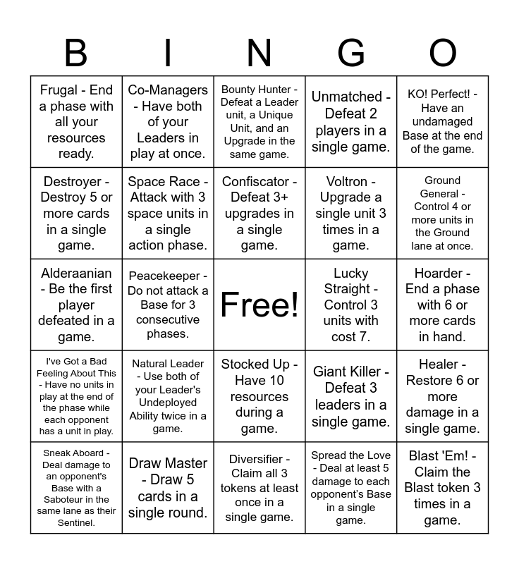 This bingo card has a free space and 50 words: Plans Within Plans - Claim the Plan token 3 times in a game., Blast 'Em! - Claim the Blast token 3 times in a game., Initiator - Claim the Initiative token 3 times in a game., Diversifier - Claim all 3 tokens at least once in a single game., Natural Leader - Use both of your Leader's Undeployed Ability twice in a game., One-Two Punch - Use both Leaders’ Deployed abilities in a single action phase., Co-Managers - Have both of your Leaders in play at once., Unlimited Power! - Destroy 5 or more cards in a single action (nested actions included)., Destroyer - Destroy 5 or more cards in a single game., Ground Assault - Attack with 3 ground units in a single action phase., Space Race - Attack with 3 space units in a single action phase., Unmatched - Defeat 2 players in a single game., Healer - Restore 6 or more damage in a single game., Giant Killer - Defeat 3 leaders in a single game., Yoink! - Gain control of an enemy unit., A Fine Addition - Gain control of an enemy upgrade., Confiscator - Defeat 3+ upgrades in a single game., Lucky Straight - Control 3 units with cost 7., Saboteur - Defeat at least 2 units with Sentinel (1 on ground, 1 in space) in a single game., KO! Perfect! - Have an undamaged Base at the end of the game., Peacekeeper - Do not attack a Base for 3 consecutive phases., Spread the Love - Deal at least 5 damage to each opponent’s Base in a single game., Frugal - End a phase with all your resources ready., Voltron - Upgrade a single unit 3 times in a game., Basebreaker - Deal 10 or more damage to a Base in a single action phase., I Have The High Ground - Control 4 or more units in the Space lane at once., Ground General - Control 4 or more units in the Ground lane at once., Fortress Builder - Control 3 or more units with Sentinel at once., Bounty Hunter - Defeat a Leader unit, a Unique Unit, and an Upgrade in the same game., Stocked Up - Have 10 resources during a game., Reinforcements Incoming - Deploy 4 units in a single action phase., Tactical Genius - Play 3 Events in a single action phase., Adaptable Leader - Use both Leaders’ abilities in the same round (one Undeployed, one Deployed)., Hunt the Hunter - Defeat a unit with Ambush using an Ambush unit., Draw Master - Draw 5 cards in a single round., Ultimate Defense - Have 3 units with Sentinel prevent Base damage in the same round., Tyrant - Attack each opponent’s Base in a single round., Endless Legions - Deploy 10 units in a single game., Surgical Strike - Defeat an opponent’s Sentinel unit without losing your attacking unit., Hoarder - End a phase with 6 or more cards in hand., Double Trouble - Use two Leaders' Deployed abilities in the same action phase., Opportunist - Destroy a damaged unit that wasn’t attacked by your units this round., Pocket Sand! - Play 2 cards with Smuggle in a single game., Saboteur - Defeat 3 or more shields in a single game., Sneak Aboard - Deal damage to an opponent's Base with a Saboteur in the same lane as their Sentinel., Alderaanian - Be the first player defeated in a game., Fell the Dragon - Defeat a unit with 5+ power., Rebellions Are Built On Hope - Begin the Action Phase with 5 or less health left on your Base., I've Got a Bad Feeling About This - Have no units in play at the end of the phase while each opponent has a unit in play. and Against All Odds - Each opponent controls an odd-costed unit.