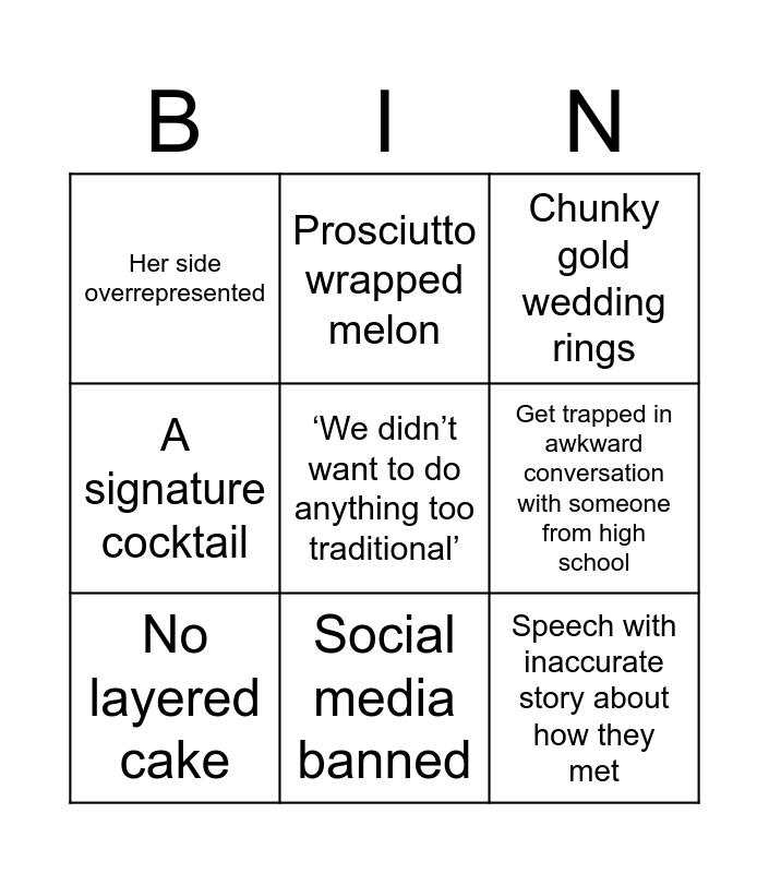 This bingo card has a free space and 8 words: Get trapped in awkward conversation with someone from high school, Chunky gold wedding rings, Prosciutto wrapped melon, No layered cake, Her side overrepresented, Speech with inaccurate story about how they met, A signature cocktail and Social media banned.