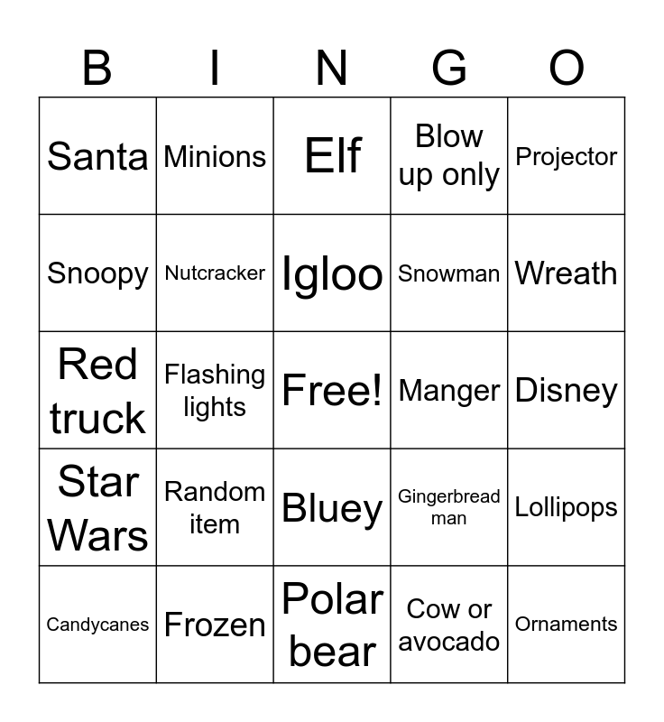 This bingo card has a free space and 57 words: Snowflakes, Candycanes, Penguin, Santa, Polar bear, Grinch, Nutcracker, Train or airplane, Snowman, Reindeer, Blow up only, Blow mold, Christmas avocado ( automatic win), Presents, Joy, Rudolph, Projector, Flashing lights, Icicle, Ornaments, Manger, Angel, Gingerbread man, Elf, North Pole sign, Igloo, Pole tree, Giant reindeer, Wreath, Noel, Garland, Star, Lanterns, Beach Santa, Disney, Snoopy, Christmas dog, Red truck, Bumble/ unicorn, Star Wars, Minions, Bluey, Archway, Bell, Giant Christmas lights, Sleigh, Random item, Frozen, Sled, Merry Christmas, Flamingo or stocking, Cow or avocado, Gnome, Front door lights, Llama, Lollipops and Gay lights.