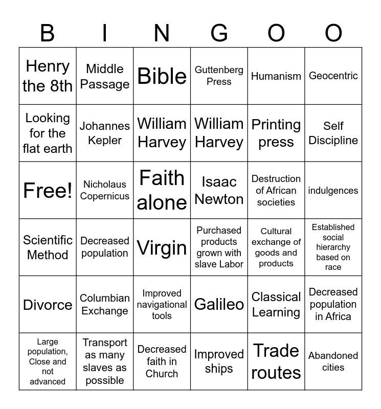 This bingo card has 36 words: Galileo, Improved navigational tools, Improved ships, Looking for the flat earth, Scientific Method, Isaac Newton, Johannes Kepler, Decreased faith in Church, Humanism, Classical Learning, Self Discipline, Guttenberg Press, Decreased population in Africa, Nicholaus Copernicus, William Harvey, Henry the 8th, Divorce, Destruction of African societies, Free!, Bible, Faith alone, Decreased population, Purchased products grown with slave Labor, Virgin, Cultural exchange of goods and products, Middle Passage, Printing press, Transport as many slaves as possible, William Harvey, Geocentric, Abandoned cities, Large population, Close and not advanced, Established social hierarchy based on race, indulgences, Columbian Exchange and Trade routes.