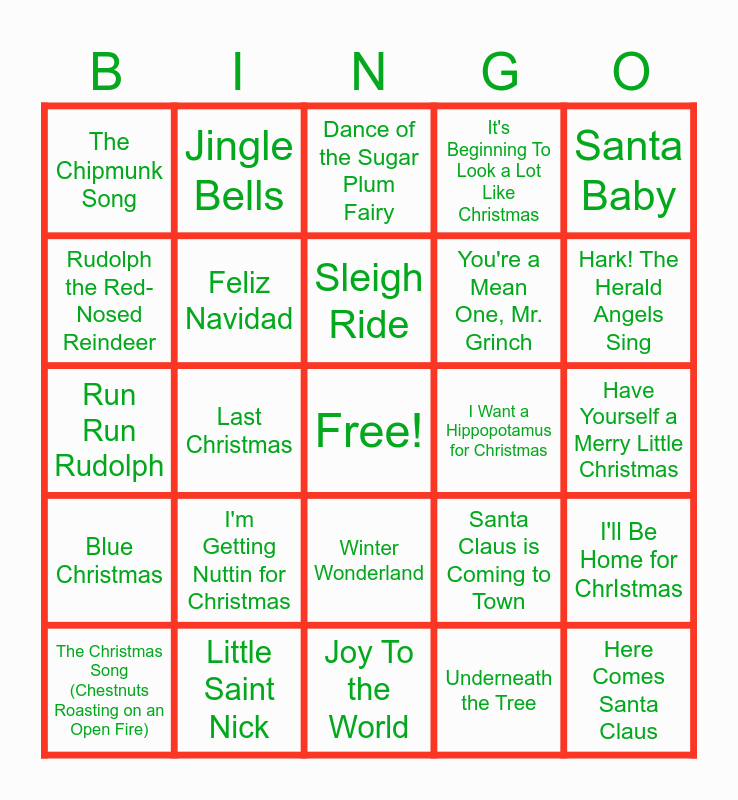 This bingo card has a free space and 40 words: Rockin' Around the Christmas Tree, Run Run Rudolph, Deck the Halls, Feliz Navidad, Little Saint Nick, Winter Wonderland, Sleigh Ride, All I Want for Christmas is You, Santa Baby, Blue Christmas, Last Christmas, It's Beginning To Look a Lot Like Christmas, Here Comes Santa Claus, Have Yourself a Merry Little Christmas, I Want a Hippopotamus for Christmas, I'm Getting Nuttin for Christmas, Grandma Got Run Over By a Reindeer, The Chipmunk Song, It Came Upon a Midnight Clear, Dance of the Sugar Plum Fairy, I'll Be Home for ChrIstmas, Underneath the Tree, You're a Mean One, Mr. Grinch, Rudolph the Red-Nosed Reindeer, Frosty the Snowman, Baby It's Cold Outside, Carol of the Bells, A Holly Jolly Christmas, Let It Snow, Let It Snow, Let It Snow, Jingle Bell Rock, White Christmas, The Christmas Song (Chestnuts Roasting on an Open Fire), Silver Bells, Santa Claus is Coming to Town, Hark! The Herald Angels Sing, Joy To the World, We Wish You a Merry Christmas, Twelve Days fo Christmas, Jingle Bells and Please Come Home for Christmas.