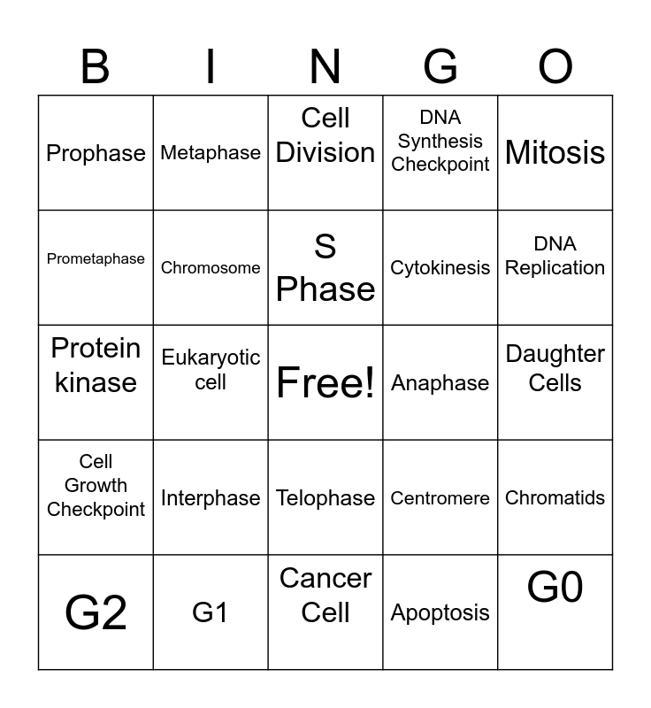 This bingo card has a free space and 24 words: Interphase, G1, S Phase, G2, Mitosis, Prophase, Prometaphase, Metaphase, Anaphase, Telophase, Cytokinesis, Protein kinase, Centromere, Chromatids, Chromosome, Apoptosis, Daughter Cells, Cell Division, DNA Replication, Eukaryotic cell, G0, Cell Growth Checkpoint, DNA Synthesis Checkpoint and Cancer Cell.