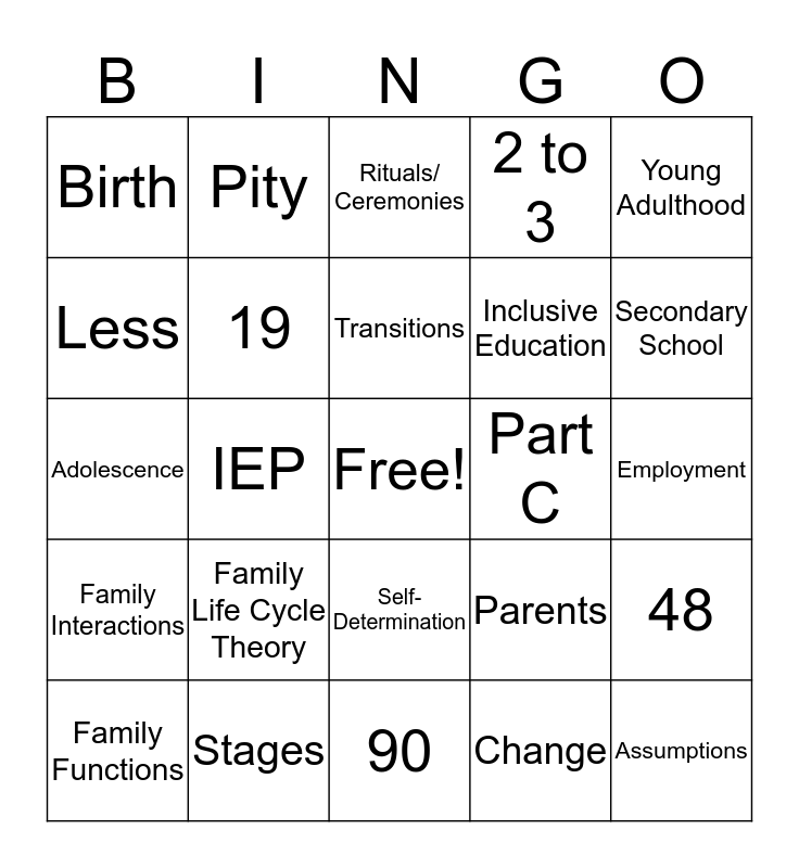 This bingo card has a free space and 24 words: Family Life Cycle Theory, Stages, Transitions, Family Functions, Young Adulthood, Birth, Less, Pity, Part C, Self-Determination, Inclusive Education, Adolescence, Parents, 48, 19, Change, Employment, Rituals/ Ceremonies, Secondary School, IEP, Assumptions, Family Interactions, 2 to 3 and 90.