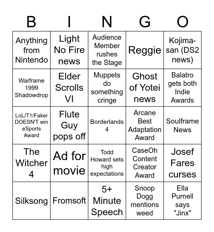 This bingo card has a free space and 24 words: Ad for movie, Fromsoft, Muppets do something cringe, Silksong, Kojima-san (DS2 news), Anything from Nintendo, Warframe 1999 Shadowdrop, Light No Fire news, Arcane Best Adaptation Award, Todd Howard sets high expectations, Ghost of Yotei news, LoL/T1/Faker DOESN'T win eSports Award, CaseOh Content Creator Award, Josef Fares curses, Elder Scrolls VI, Snoop Dogg mentions weed, Soulframe News, Audience Member rushes the Stage, Balatro gets both Indie Awards, Flute Guy pops off, Ella Purnell says "Jinx", The Witcher 4, Reggie and 5+ Minute Speech.