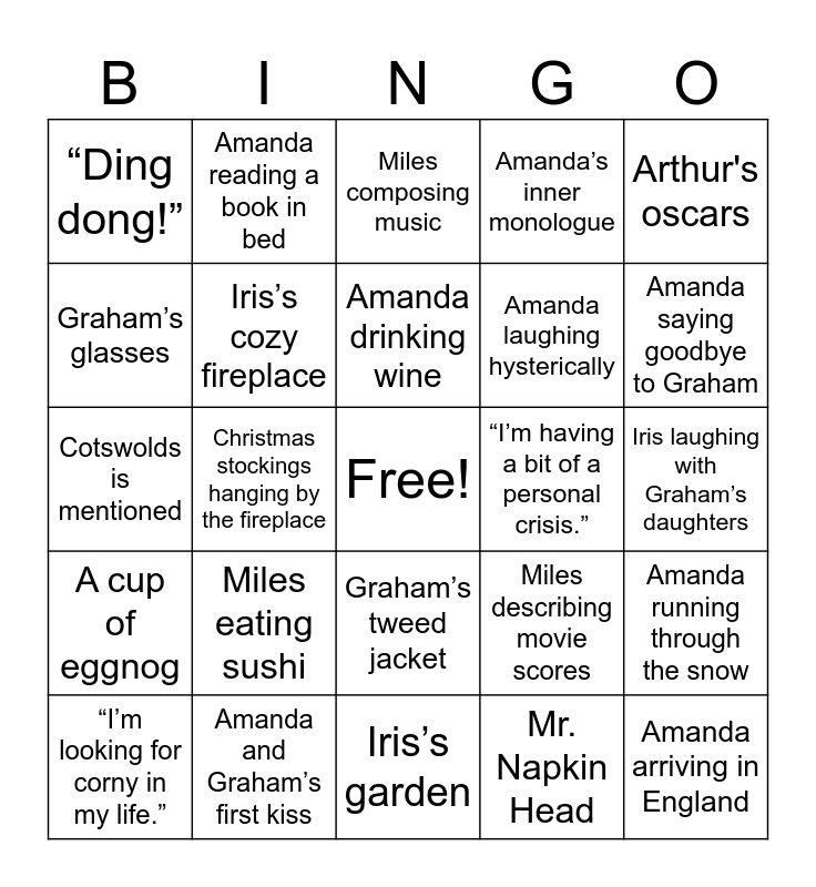 This bingo card has a free space and 132 words: "Cute dress", A bottle of champagne, A bottle of red wine, A Christmas tree, A Christmas wreath, A cozy blanket, A cup of eggnog, A dog leash (for Amanda’s dog), A handwritten note, A hot chocolate mug, A kiss under mistletoe, A pair of gloves, A phone booth in England, A roaring fire, A set of curtains, A sledding scene, A snowy road, A stack of books, A typewriter, A vintage movie poster, A wrapped gift, Amanda and Graham’s first kiss, Amanda arriving in England, Amanda breaking up with Ethan, Amanda crying, Amanda dancing around the house, Amanda drinking wine, Amanda driving on the wrong side of the road, Amanda in the bathtub, Amanda kissing Graham, Amanda laughing hysterically, Amanda reading a book in bed, Amanda running through the snow, Amanda saying goodbye to Graham, Amanda sitting by the fireplace, Amanda slamming the car door, Amanda struggling with emotions, Amanda’s car in the snow, Amanda’s DVD collection, Amanda’s high heels, Amanda’s inner monologue, Amanda’s luggage set, Amanda’s luxurious LA mansion, Amanda’s plush bed, Arthur calling Iris “lovely”, Arthur reminiscing, Arthur talking about old Hollywood, Arthur walking up the stairs at the Writers Guild event, Arthur's Oscars, Arthur's oscars, Arthur's Theme Song, Arthur’s cane, Arthur’s collection of Oscars, Arthur’s montage of memories, Blockbuster, Christmas carolers, Christmas Eve dinner, Christmas fettuccine, Christmas ornaments, Christmas stockings hanging by the fireplace, Cotswolds is mentioned, Dustin Hoffman, Graham being a “handsome stranger”, Graham calling Amanda, Graham crying, Graham introducing Amanda to his daughters, Graham telling a story, Graham’s daughters surprising Amanda, Graham’s daughters’ artwork, Graham’s glasses, Graham’s leather bag, Graham’s tweed jacket, Gumption is mentioned, Hanukkah dinner, Iris and Arthur workout, Iris crying in the car, Iris dancing around Amanda’s house, Iris decorating Arthur’s house, Iris decorating for Christmas, Iris exploring Amanda’s LA mansion, Iris falling asleep on Amanda’s couch, Iris giving advice, Iris hugging Arthur, Iris laughing with Graham’s daughters, Iris making tea, Iris turning on the music in Amanda’s house, Iris walking in the countryside, Iris watching a classic movie with Arthur, Iris's theme song, Iris’s charming English cottage, Iris’s cozy fireplace, Iris’s floral teapot, Iris’s fluffy scarf, Iris’s garden, Iris’s journal, Iris’s quaint kitchen, Iris’s suitcase, Jasper appears, Jon Krasinski, Miles and Iris holding hands, Miles composing music, Miles describing movie scores, Miles eating sushi, Miles making a surprise appearance, Miles picking up food, Miles playing the piano for Iris, Miles singing a theme song, Miles’s film score sheet music, Miles’s piano, Mini Cooper, Mr. Brightside, Mr. Napkin Head, New Mexico is mentioned, Outdated Technology, Snowfall, Staring contest with a dog, The "Movie Trailer Voice" recording equipment, The end-of-the-year party, The holiday lights in the LA mansion, The key exchange envelope, The snow globe, The snow-covered landscape in England, The star on a Christmas tree, “Ding dong!”, “How do you know my name?”, “I’m having a bit of a personal crisis.”, “I’m looking for corny in my life.”, “Low point!”, “We’re the three musketeers!”, “You know, I’ve got a cow.”, “You’re not a bad person. You’re just a little lost.” and “You’re supposed to be the leading lady of your own life!”.