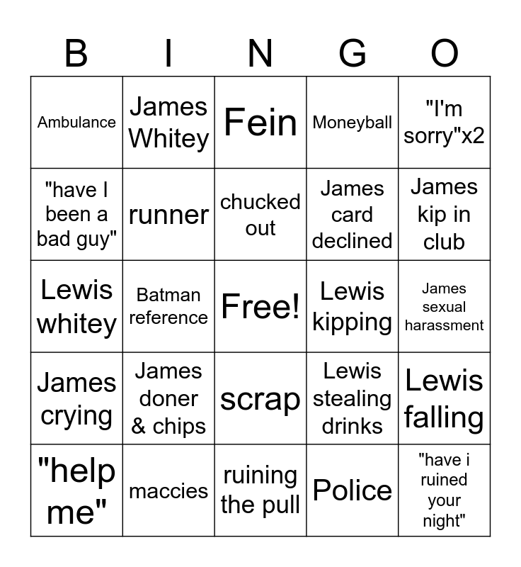 This bingo card has a free space and 24 words: James doner & chips, maccies, chucked out, "help me", "I'm sorry"x2, Ambulance, "have I been a bad guy", James Whitey, Lewis kipping, scrap, James card declined, Lewis whitey, Lewis stealing drinks, Lewis falling, runner, Police, James sexual harassment, Fein, James kip in club, Batman reference, "have i ruined your night", James crying, Moneyball and ruining the pull.
