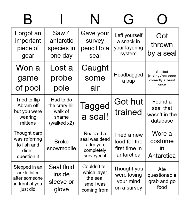This bingo card has a free space and 24 words: Broke snowmobile, Seal fluid inside sleeve or glove, Caught some air, Stepped in an ankle biter after someone in front of you just did, Got thrown by a seal, Forgot an important piece of gear, Won a game of pool, Saw 4 antarctic species in one day, Got hut trained, Realized a seal was dead after you completely surveyed it, Headbagged a pup, Tried to flip Abram off but you were wearing mittens, Tried a new food for the first time in antarctica, Wore a costume in Antarctica, Lost a probe pole, Thought you were losing your mind on a survey, Found a seal that wasn’t in the database, Gave your survey pencil to a seal, Spelled țřẼĞēŷ୰åëEeeee correctly at least once, Had to do the crary hill walk of shame (walked x2), Ate questionable grab and go food, Thought carp was referring to fish and didn’t question it, Left yourself a snack in your layering system and Couldn’t tell which layer the seal smell was coming from.