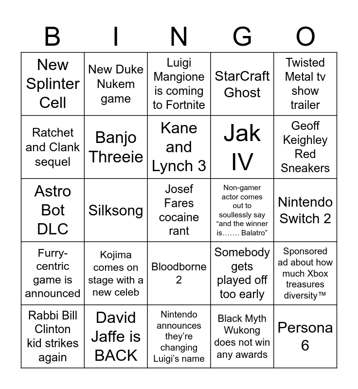 This bingo card has a free space and 24 words: Kojima comes on stage with a new celeb, David Jaffe is BACK, Kane and Lynch 3, Rabbi Bill Clinton kid strikes again, Twisted Metal tv show trailer, New Splinter Cell, Ratchet and Clank sequel, New Duke Nukem game, Non-gamer actor comes out to soullessly say “and the winner is……. Balatro”, Bloodborne 2, Jak IV, Astro Bot DLC, Somebody gets played off too early, Sponsored ad about how much Xbox treasures diversity™️, Banjo Threeie, Black Myth Wukong does not win any awards, Nintendo Switch 2, Luigi Mangione is coming to Fortnite, Geoff Keighley Red Sneakers, Silksong, Persona 6, Furry-centric game is announced, StarCraft Ghost and Nintendo announces they’re changing Luigi’s name.
