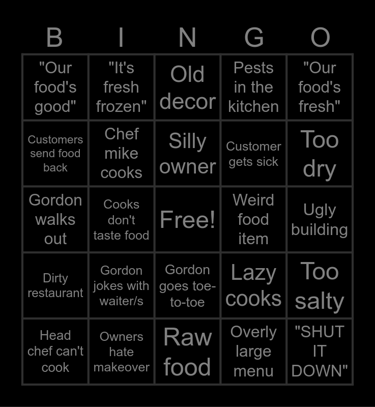 This bingo card has a free space and 24 words: Gordon jokes with waiter/s, Owners hate makeover, Silly owner, Head chef can't cook, "Our food's fresh", "Our food's good", Customers send food back, "It's fresh frozen", Weird food item, Gordon goes toe-to-toe, Customer gets sick, Gordon walks out, Lazy cooks, Too salty, Chef mike cooks, Overly large menu, Ugly building, Old decor, Too dry, Cooks don't taste food, "SHUT IT DOWN", Dirty restaurant, Pests in the kitchen and Raw food.