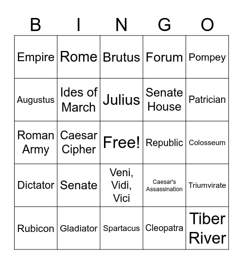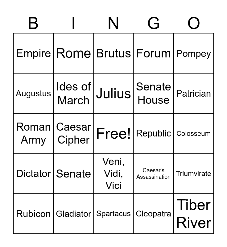 This bingo card has a free space and 24 words: Senate, Gladiator, Julius, Rubicon, Pompey, Empire, Augustus, Rome, Republic, Veni, Vidi, Vici, Senate House, Roman Army, Caesar's Assassination, Triumvirate, Ides of March, Cleopatra, Colosseum, Brutus, Patrician, Caesar Cipher, Tiber River, Dictator, Forum and Spartacus.