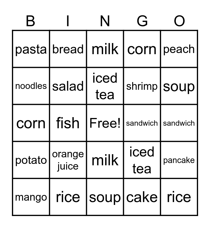 This bingo card has a free space and 33 words: beef, pork, fish, orange juice, potato, salad, peach, mango, bread, chicken, iced tea, milk, pizza, pasta, sandwich, soup, rice, corn, orange juice, iced tea, milk, pizza, pasta, sandwich, soup, rice, corn, shrimp, noodles, pancake, waffle, cake and cookie.