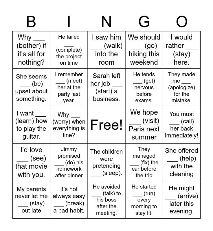 This bingo card has a free space and 24 words: Jimmy promised ___ (do) his homework after dinner, It’s not always easy ___ (break) a bad habit., Sarah left her job ___ (start) a business., My parents never let me ___ (stay) out late, I would rather ___ (stay) here., Why ___ (bother) if it’s all for nothing?, She seems ___ (be) upset about something., He failed ___ (complete) the project on time, We hope ___ (visit) Paris next summer, The children were pretending ___ (sleep)., He tends ___ (get) nervous before exams., I want ___ (learn) how to play the guitar., They managed ___ (fix) the car before the trip, She offered ___ (help) with the cleaning, I remember ___ (meet) her at the party last year., He started ___ (run) every morning to stay fit., You must ___ (call) her back immediately!, I saw him ___ (walk) into the room, They made me ___ (apologize) for the mistake., Why ___ (worry) when everything is fine?, He might ___ (arrive) later this evening., I’d love ___ (see) that movie with you., We should ___ (go) hiking this weekend and He avoided ___ (talk) to his boss after the meeting..