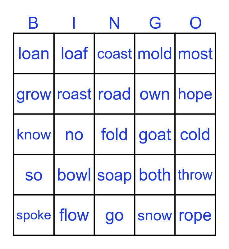 This bingo card has 25 words: bowl, go, road, spoke, most, loan, grow, loaf, goat, soap, own, know, both, throw, roast, rope, cold, coast, hope, no, fold, flow, so, mold and snow.