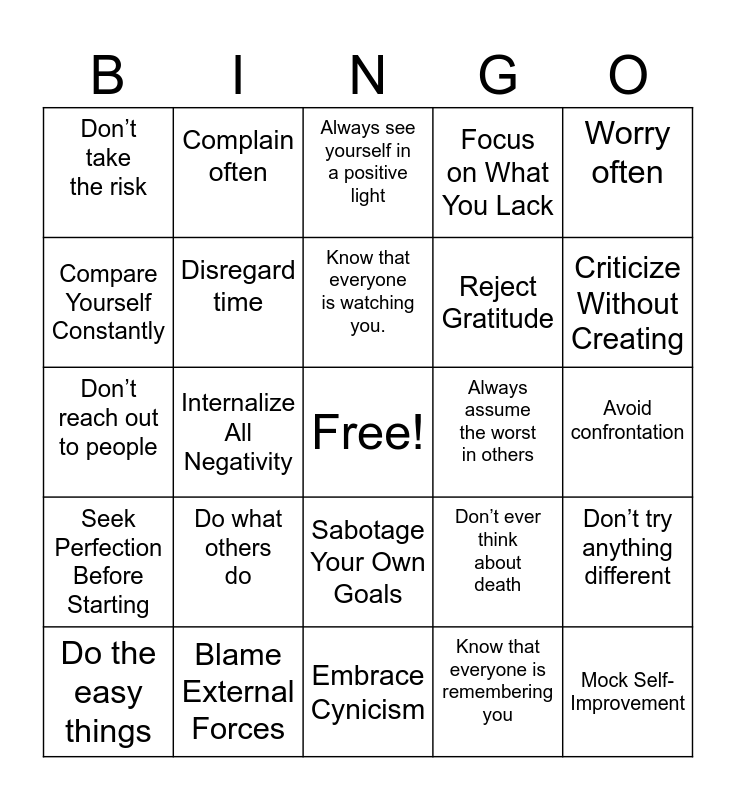 This bingo card has a free space and 24 words: Do the easy things, Do what others do, Know that everyone is watching you., Know that everyone is remembering you, Worry often, Don’t take the risk, Complain often, Always see yourself in a positive light, Always assume the worst in others, Avoid confrontation, Don’t reach out to people, Disregard time, Don’t ever think about death, Don’t try anything different, Compare Yourself Constantly, Blame External Forces, Embrace Cynicism, Focus on What You Lack, Criticize Without Creating, Seek Perfection Before Starting, Internalize All Negativity, Sabotage Your Own Goals, Reject Gratitude and Mock Self-Improvement.