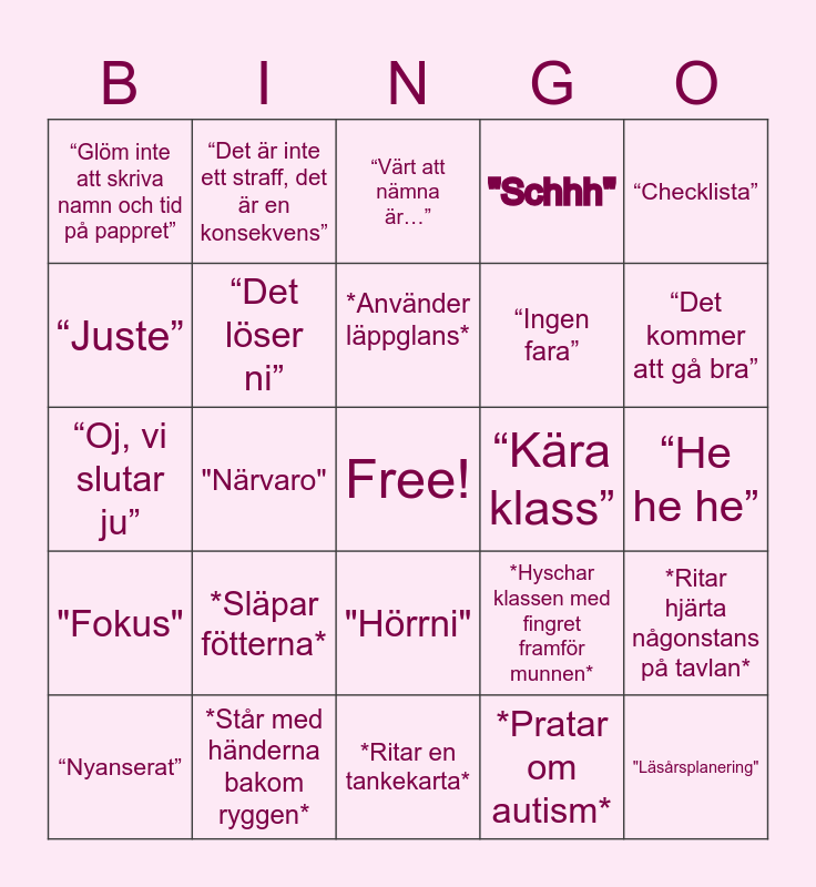 This bingo card has a free space and 24 words: *Släpar fötterna*, *Står med händerna bakom ryggen*, *Använder läppglans*, “Nyanserat”, “Checklista”, “Glöm inte att skriva namn och tid på pappret”, “Juste”, “Det är inte ett straff, det är en konsekvens”, “Kära klass”, "Hörrni", “Ingen fara”, “Oj, vi slutar ju”, *Hyschar klassen med fingret framför munnen*, *Ritar hjärta någonstans på tavlan*, “Det löser ni”, *Pratar om autism*, “He he he”, “Värt att nämna är…”, “Det kommer att gå bra”, "Närvaro", "Läsårsplanering", "Fokus", "Schhh" and *Ritar en tankekarta*.