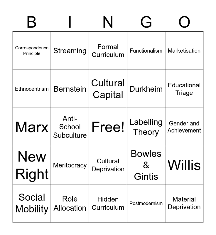 This bingo card has a free space and 25 words: Meritocracy, Hidden Curriculum, Cultural Capital, Social Mobility, Marketisation, Correspondence Principle, Ethnocentrism, Streaming, Labelling Theory, Cultural Deprivation, Durkheim, Marx, Bowles & Gintis, Willis, Bernstein, Bourdieu, Gender and Achievement, Formal Curriculum, Educational Triage, Anti-School Subculture, Material Deprivation, Role Allocation, New Right, Functionalism and Postmodernism.