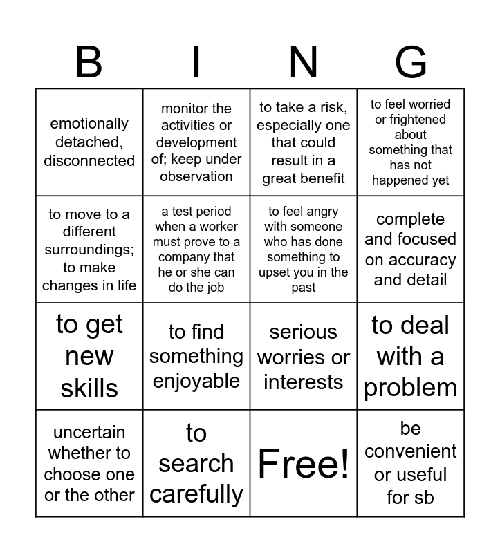 This bingo card has 17 words: Free!, uncertain whether to choose one or the other, to take a risk, especially one that could result in a great benefit, emotionally detached, disconnected, to find something enjoyable, to feel worried or frightened about something that has not happened yet, to deal with a problem, to feel angry with someone who has done something to upset you in the past, complete and focused on accuracy and detail, a test period when a worker must prove to a company that he or she can do the job, to search carefully, serious worries or interests, to move to a different surroundings; to make changes in life, monitor the activities or development of; keep under observation, to get new skills, later; in the future and be convenient or useful for sb.