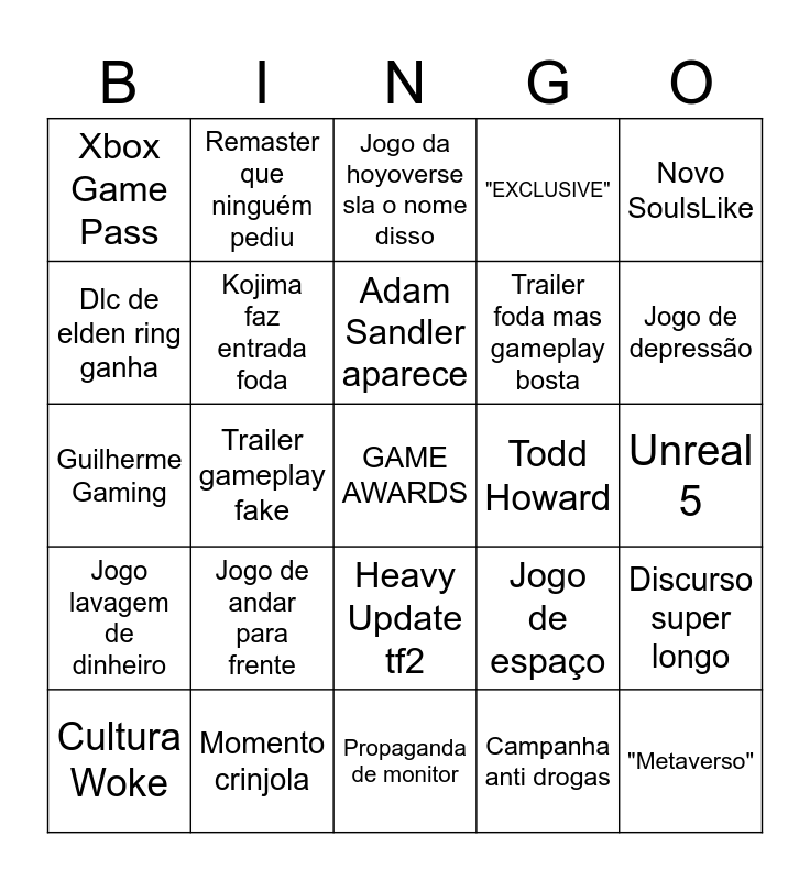 This bingo card has a free space and 48 words: Jogo NFT, "Metaverso", Fortnite, Propaganda de monitor, Jogo de andar para frente, Nintendo anuncia RPG genérico, Remaster que ninguém pediu, Meme que já morreu, Dlc de elden ring ganha, Balatro Ganha, Kojima faz entrada foda, "EXCLUSIVE", Discurso super longo, Jogo de espaço, GOD HAND 2, Dino Crysis, Adam Sandler aparece, Todd Howard, Skyrim 2 trailer, Novo SoulsLike, Trailer gameplay fake, Campanha anti drogas, Xbox Game Pass, Trailer foda mas gameplay bosta, História Triste, Jogo de depressão, Cultura Woke, Concord, Heavy Update tf2, Jogo lavagem de dinheiro, Apresentação musical foda, Apresentação musical merda, Piada Racista, Alguém invade o palco, Momento crinjola, No Man's Sky, GTA 6, Unreal 5, problema técnico, Disponível AGORA!, Ark 2, Rust 2, Jogo da hoyoverse sla o nome disso, Matheus Gaming, Guilherme Gaming, The last of US, Half-Life 3 and Tekken ganha algo.