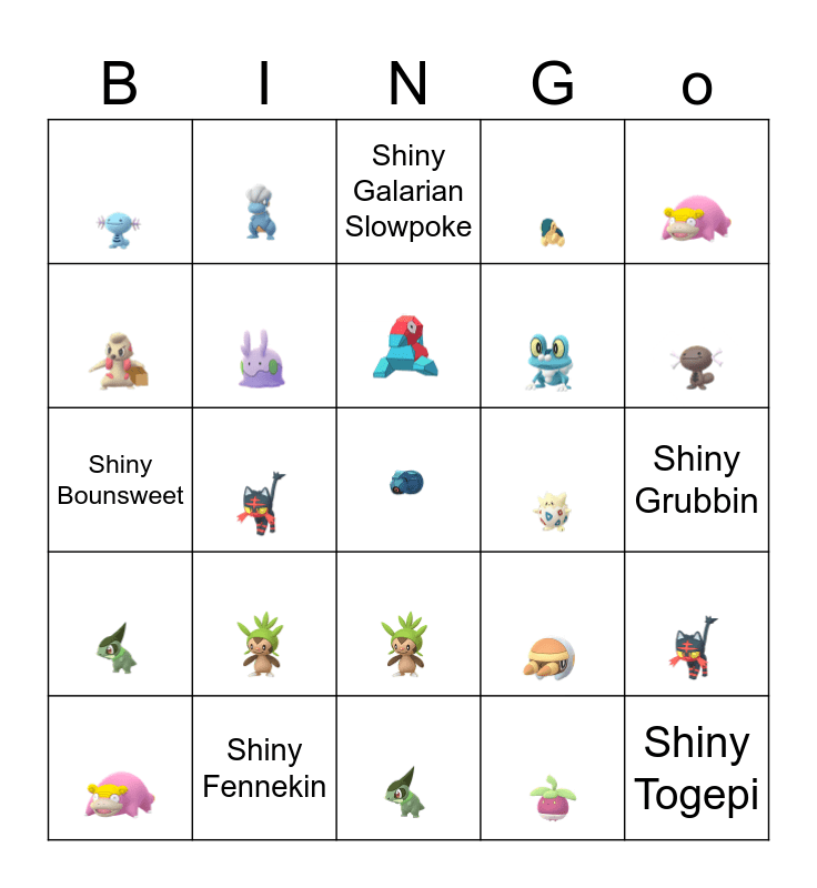 This bingo card has 31 images and 17 words: Free!, Shiny Slowpoke, Shiny Timbur, Shiny Fennekin, Shiny Goomy, Shiny Cyndaquil, Shiny Grubbin, Shiny Paldean Wooper, Shiny Rowlet, Shiny Porygon, Shiny Togepi, Shiny Galarian Slowpoke, Shiny Litten, Shiny Bounsweet, Shiny Wooper, Shiny Froakie and Shiny Noibat.