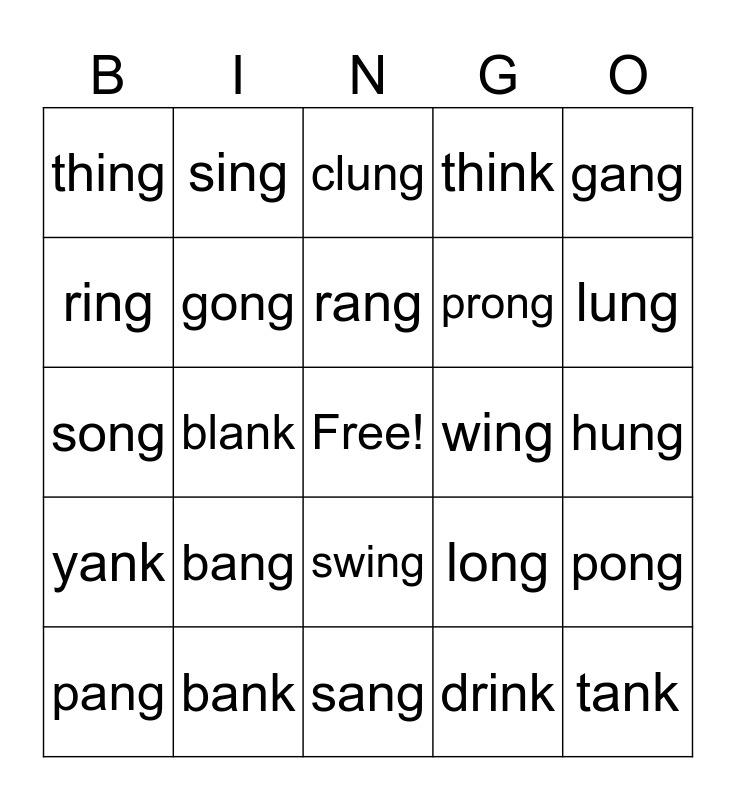 This bingo card has a free space and 25 words: bang, sang, rang, pang, gang, thing, ring, sing, wing, swing, prong, song, long, pong, gong, flung, hung, clung, lung, blank, tank, bank, yank, think and drink.