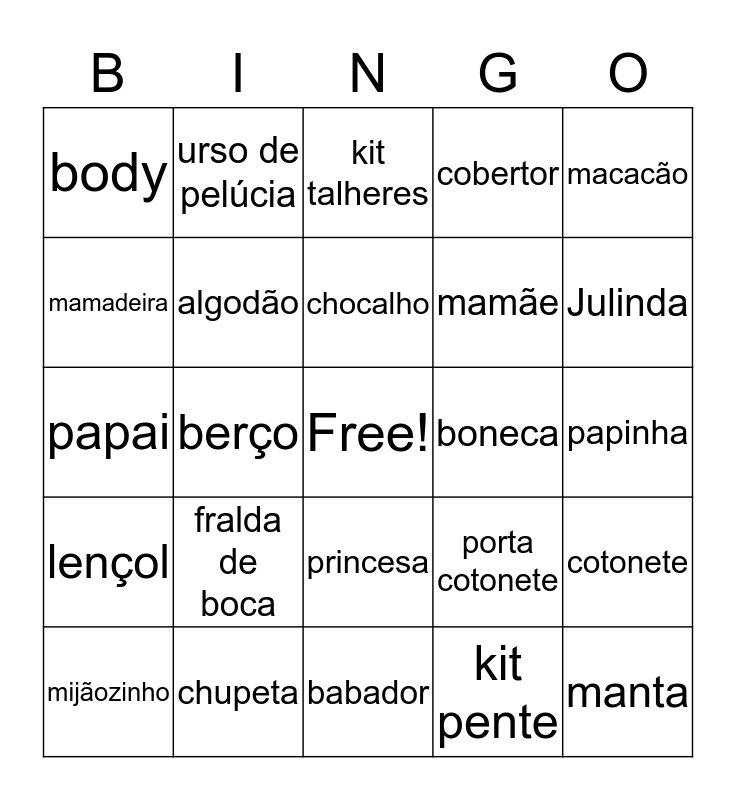 This bingo card has a free space and 24 words: fralda de boca, chupeta, chocalho, mijãozinho, macacão, body, mamadeira, urso de pelúcia, boneca, princesa, mamãe, papai, porta cotonete, cotonete, algodão, kit pente, papinha, kit talheres, Julinda, berço, manta, lençol, cobertor and babador.