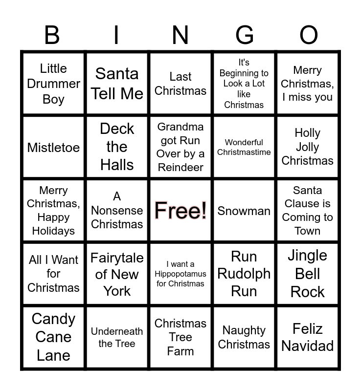 This bingo card has a free space and 27 words: Run Rudolph Run, You're a Mean One, Mr.Grinch, Wonderful Christmastime, Christmas Tree Farm, Mistletoe, Last Christmas, Santa Tell Me, All I Want for Christmas, Snowman, Jingle Bell Rock, Merry Christmas, Happy Holidays, It's Beginning to Look a Lot like Christmas, Candy Cane Lane, Underneath the Tree, Holly Jolly Christmas, Baby Please Come Home, Deck the Halls, Grandma got Run Over by a Reindeer, Fairytale of New York, Little Drummer Boy, Santa Clause is Coming to Town, Naughty Christmas, A Nonsense Christmas, Feliz Navidad, I want a Hippopotamus for Christmas, Merry Christmas, I miss you and Merry Christmas, Please Don't Call.