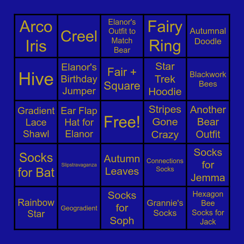 This bingo card has a free space and 24 words: Slipstravaganza, Geogradient, Fair + Square, Rainbow Star, Autumnal Doodle, Arco Iris, Hive, Creel, Stripes Gone Crazy, Autumn Leaves, Star Trek Hoodie, Gradient Lace Shawl, Connections Socks, Socks for Jemma, Elanor's Birthday Jumper, Grannie's Socks, Another Bear Outfit, Elanor's Outfit to Match Bear, Blackwork Bees, Ear Flap Hat for Elanor, Hexagon Bee Socks for Jack, Socks for Bat, Fairy Ring and Socks for Soph.