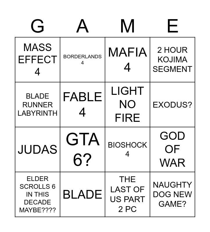 This bingo card has 16 words: BLADE, GOD OF WAR, MAFIA 4, MASS EFFECT 4, JUDAS, BORDERLANDS 4, BIOSHOCK 4, THE LAST OF US PART 2 PC, BLADE RUNNER LABYRINTH, FABLE 4, ELDER SCROLLS 6 IN THIS DECADE MAYBE????, 2 HOUR KOJIMA SEGMENT, GTA 6?, EXODUS?, LIGHT NO FIRE and NAUGHTY DOG NEW GAME?.